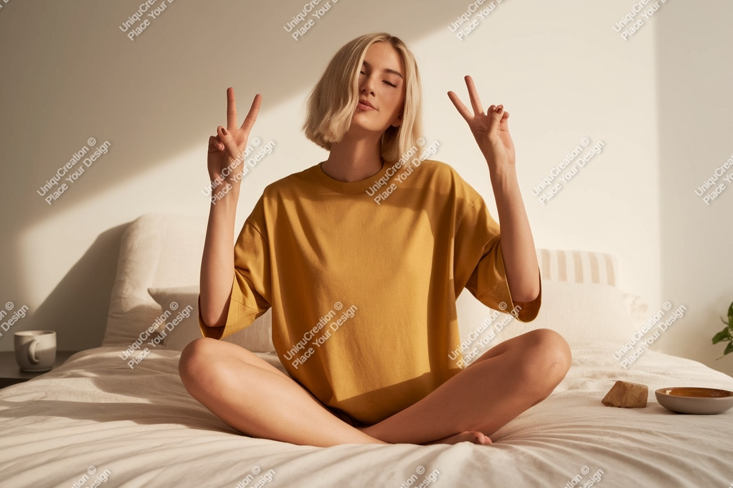 Similar Design Products to Young woman peace gesture on bed blonde yellow