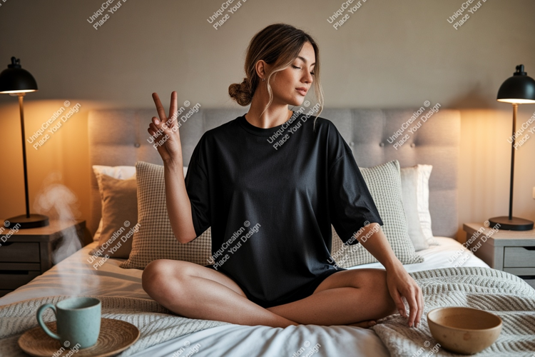 Black Shirt Mockup Woman Peaceful Meditation Bed T Cozy Bedroom