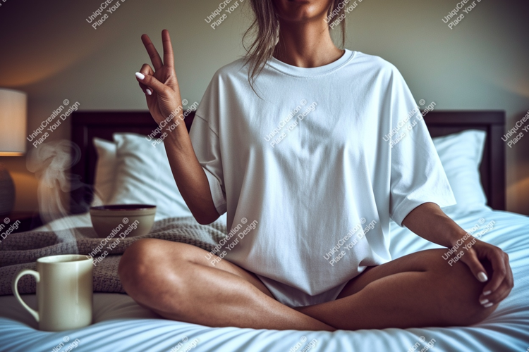 Tshirt Sign Mockup Woman Peace White Bed Mug Morning Bedroom