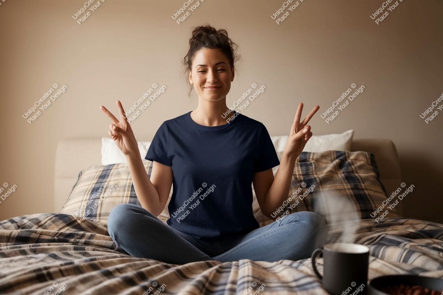 Shirt Sign Woman Dark Peace Jeans Bed Blanket Plaid Seated
