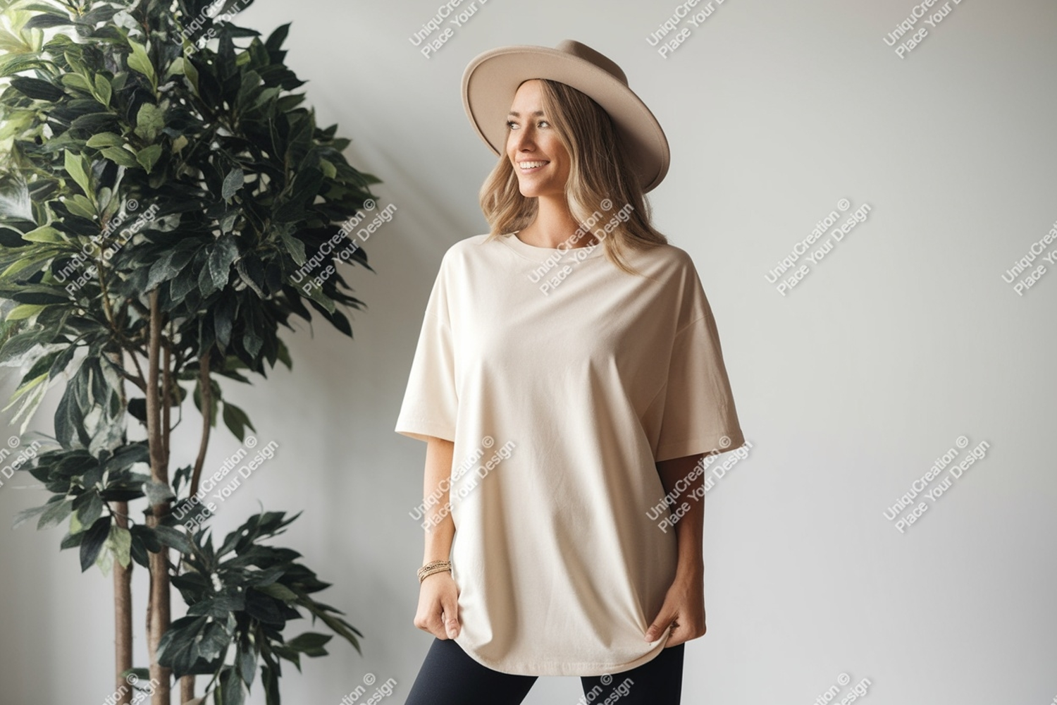Similar Design Products to Woman wearing oversized cream t shirt and hat image