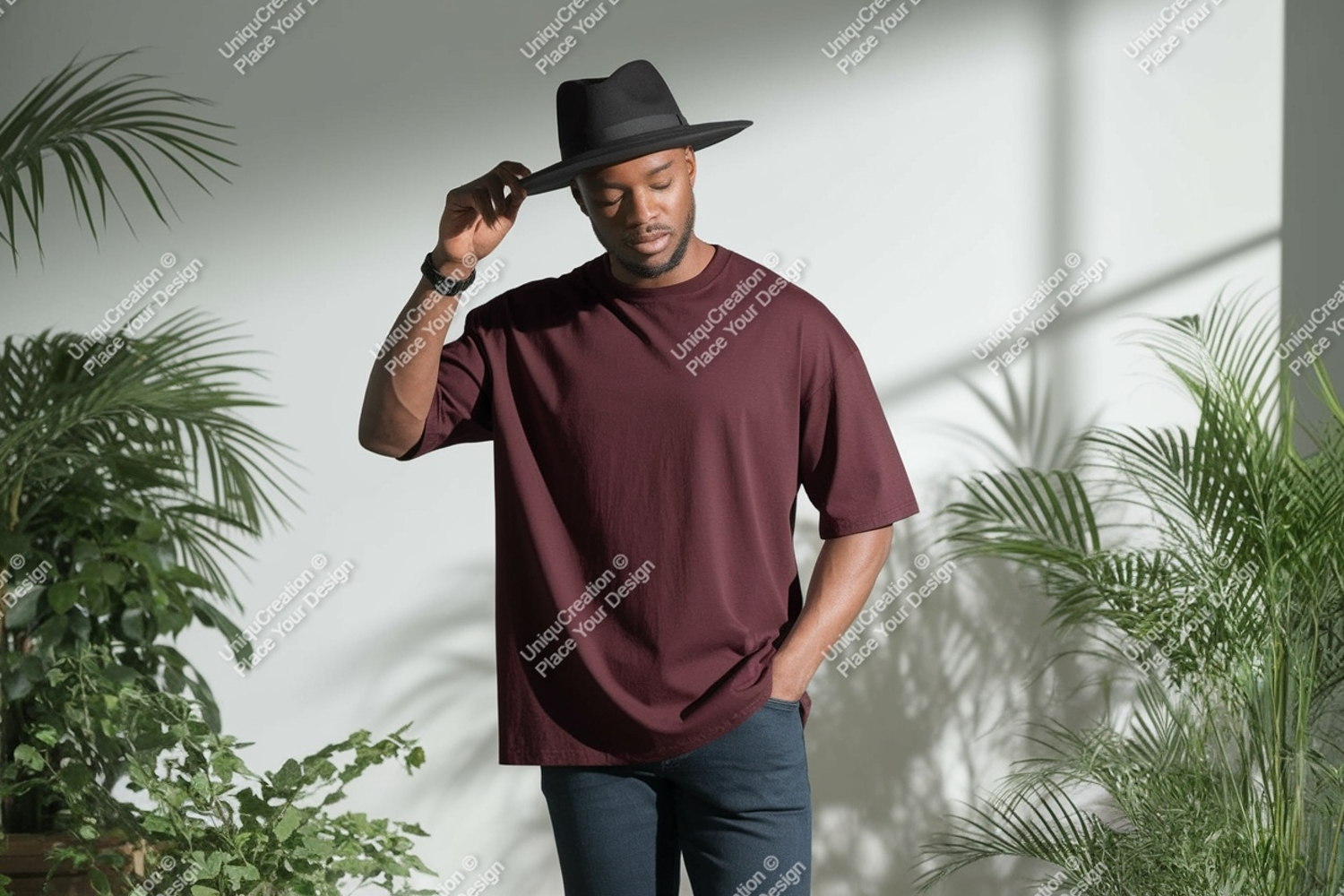 Man Black T-shirt Mockup Studio Hat Plants Shadows Maroon