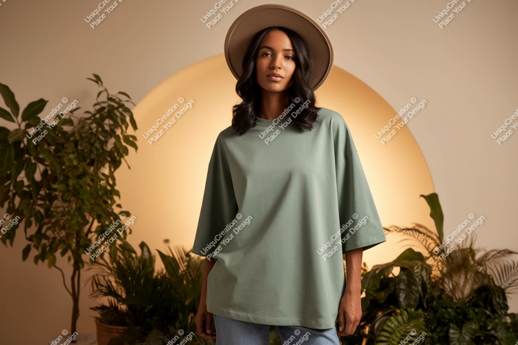 Similar Design Products to Woman wearing oversized green t shirt and hat image