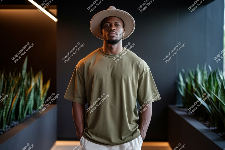 Similar Design Products to Man wearing olive green t shirt and hat image