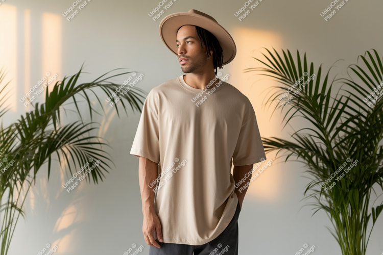 Fashion Man Shirt Casual Mockup Beige Hat Plants T Indoor