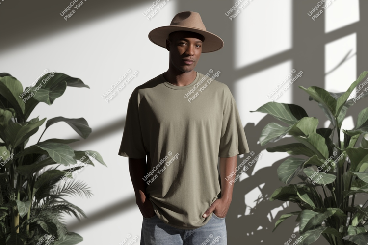Fashion Man Shirt Casual Green Mockup Beige Hat Plants T