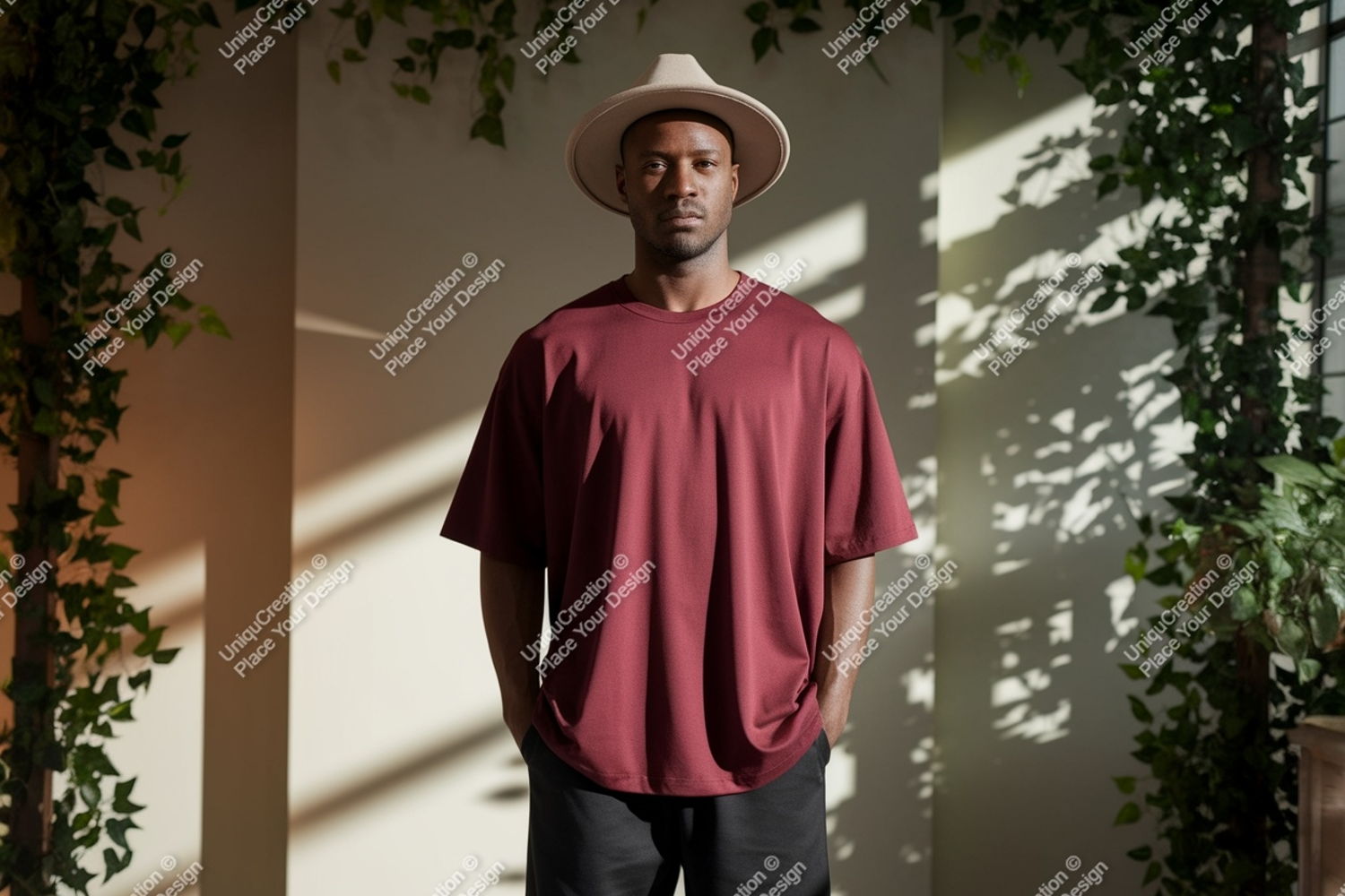 Man T-shirt Mockup Hat Plants Shadows Maroon