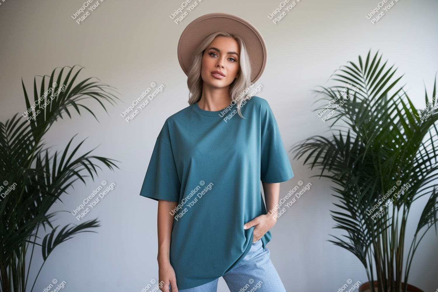 Fashion Shirt Casual Mockup Woman Teal Hat Plants T Indoor