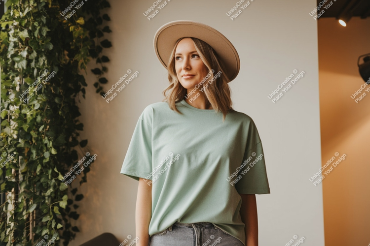 Fashion T-shirt Casual Green Mockup Woman Beige Hat Portrait Indoor