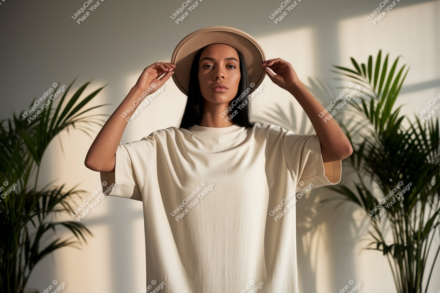 Light Fashion Shirt Mockup Woman Beige Hat Plants T Indoor