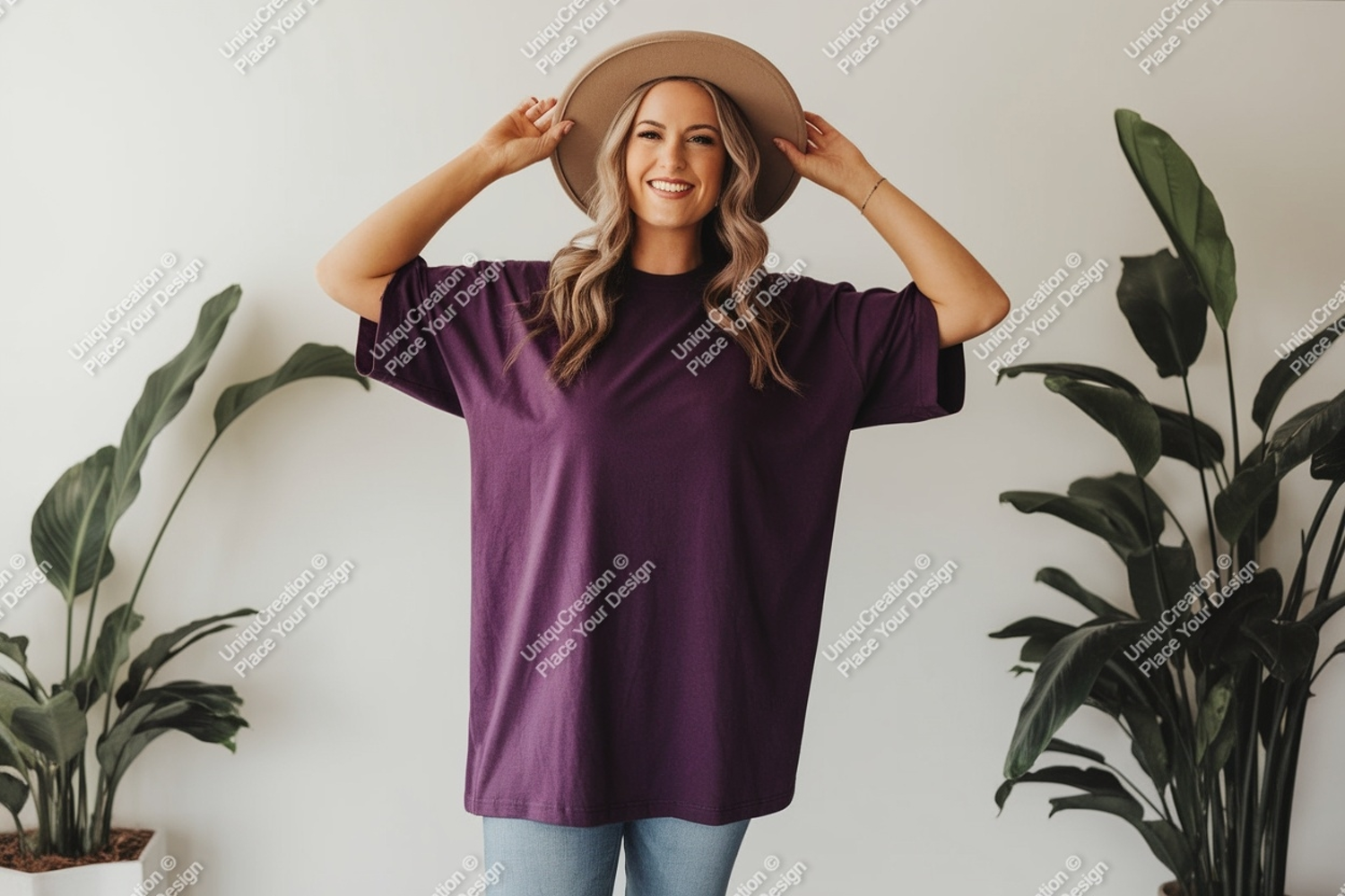 Fashion Shirt Casual Mockup Woman Purple Hat Plants T