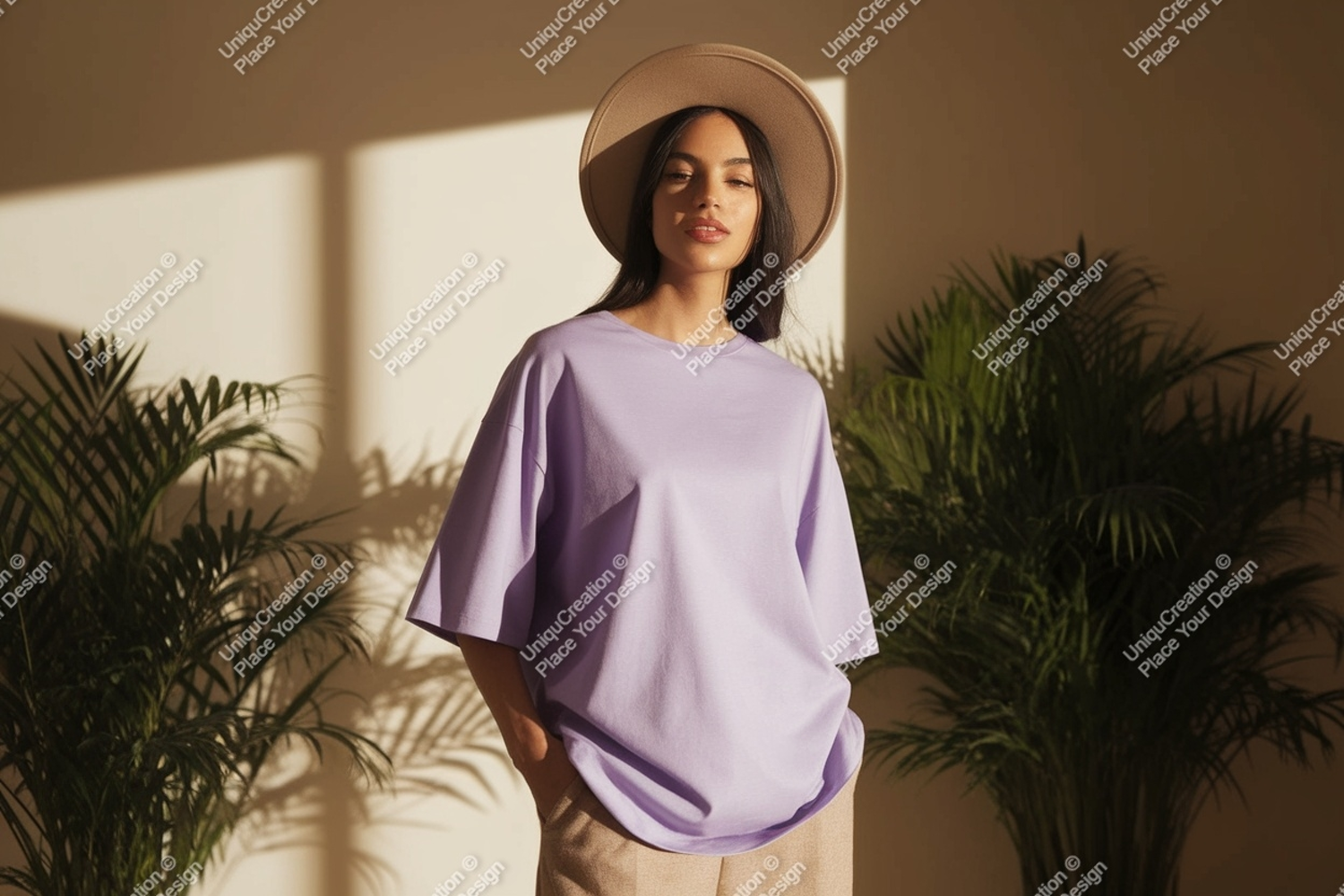 Fashion T-shirt Casual Mockup Woman Lavender Hat Plants Shadows Sunlight