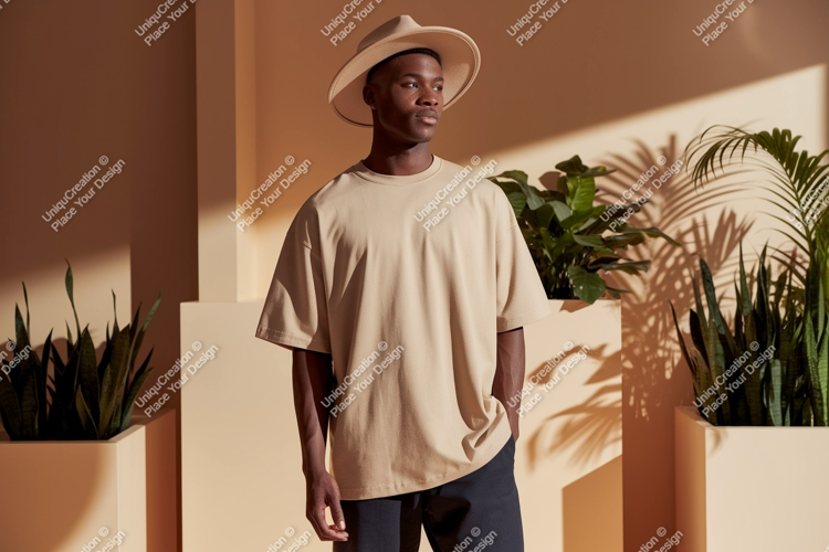 Man Shirt Mockup Studio Hat Tan Plants Shadows T