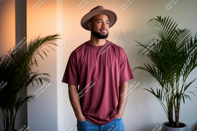 Fashion Man T-shirt Casual Mockup Hat Portrait Plants Indoor Maroon