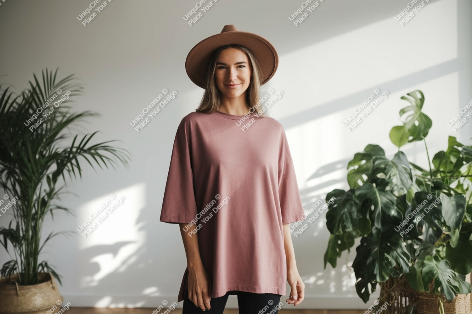 Fashion T-shirt Pink Casual Mockup Woman Hat Plants Indoor