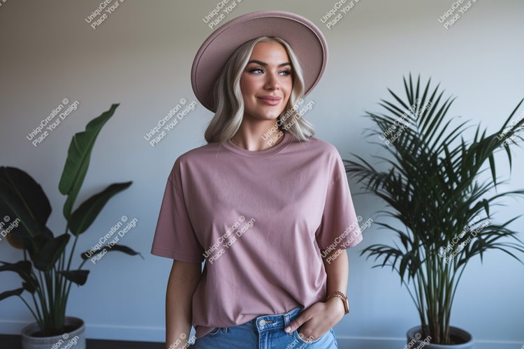 Fashion Shirt Pink Casual Mockup Woman Hat Plants T
