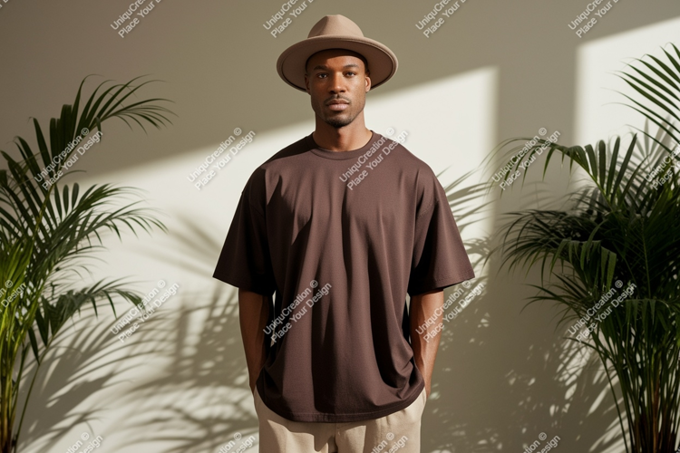 Light Man Shirt Mockup Brown Hat Plants Shadows T