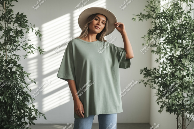Fashion T-shirt Casual Green Mockup Woman Hat Plants Indoor