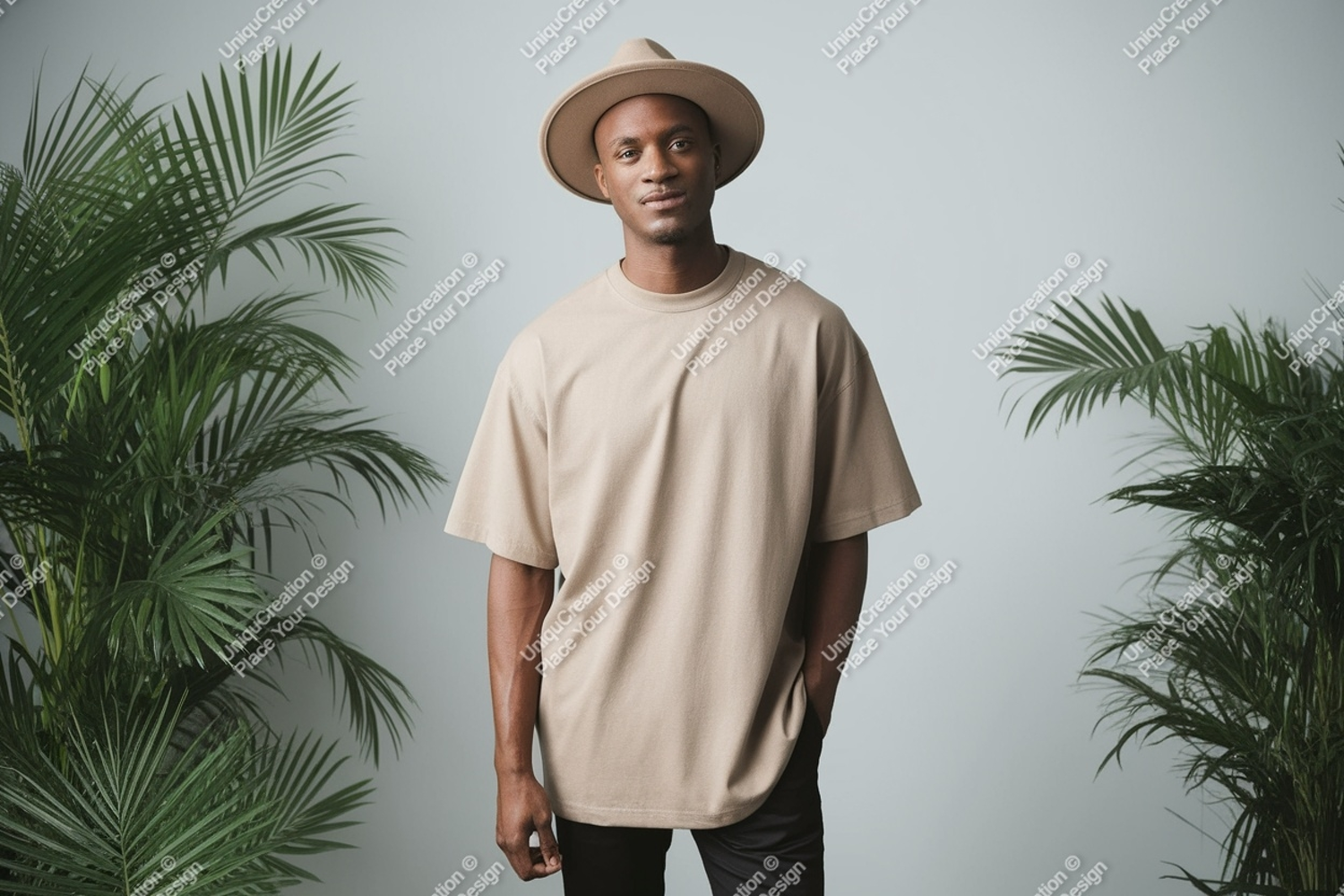 Fashion Man Shirt Casual Mockup Beige Hat Plants T