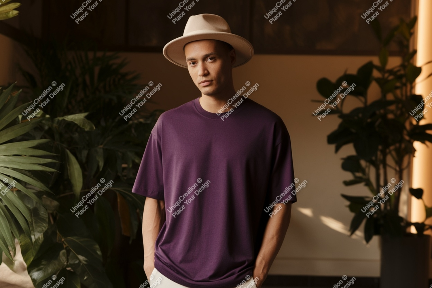 Fashion Man T-shirt Casual Mockup Purple Hat Plants Indoor