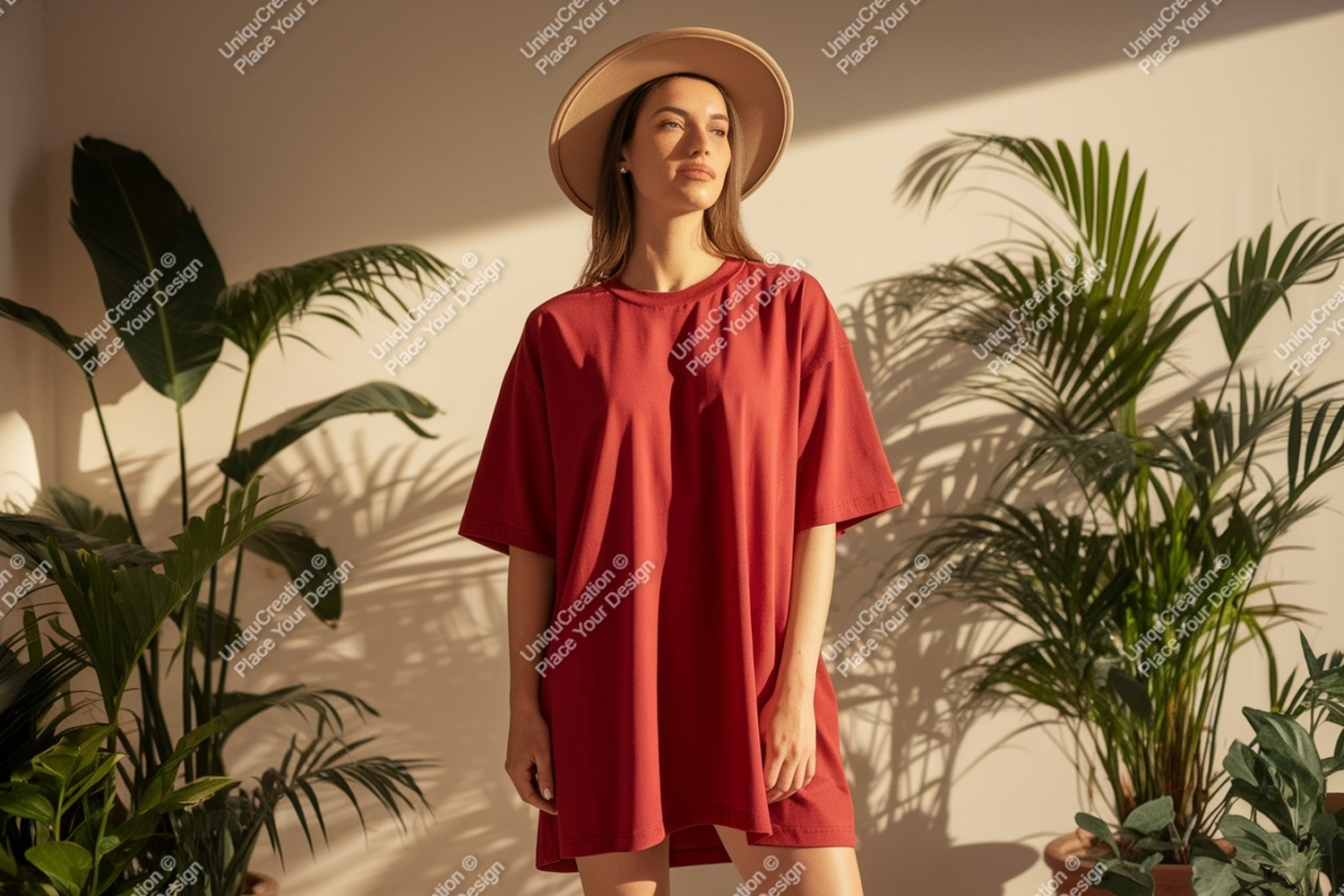 Similar Design Products to Woman wearing oversized red t-shirt and hat