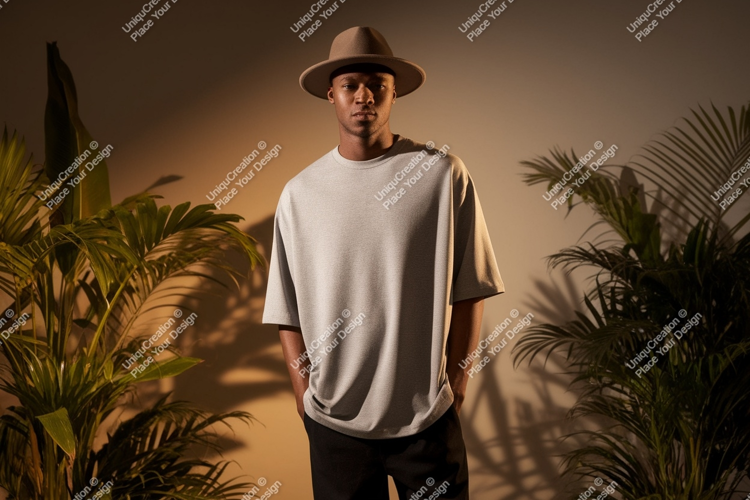 Fashion Man Shirt Mockup Studio Hat Portrait Grey Plants T