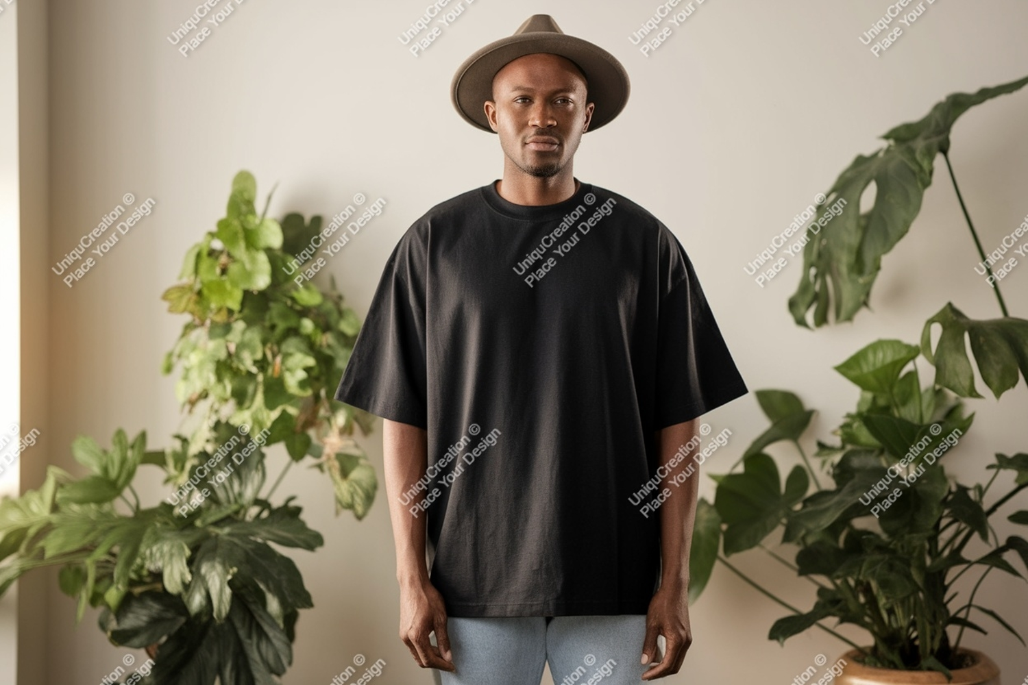 Fashion Man Black T-shirt Casual Mockup Hat Plants Indoor