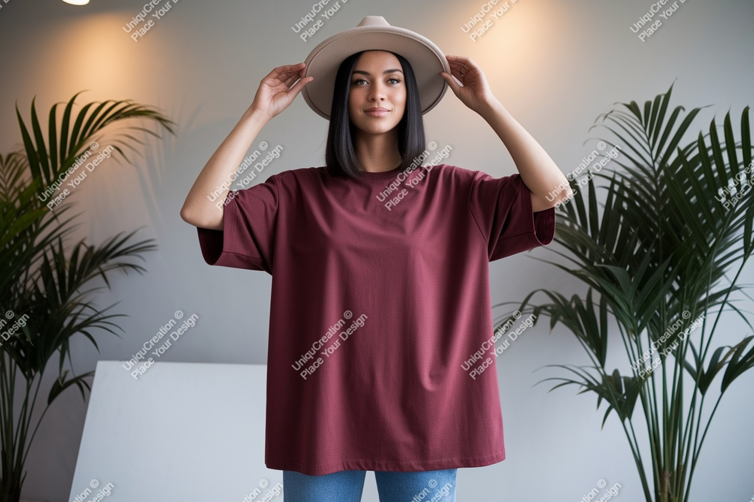 Fashion Shirt Casual Mockup Woman Studio Hat Plants T Maroon