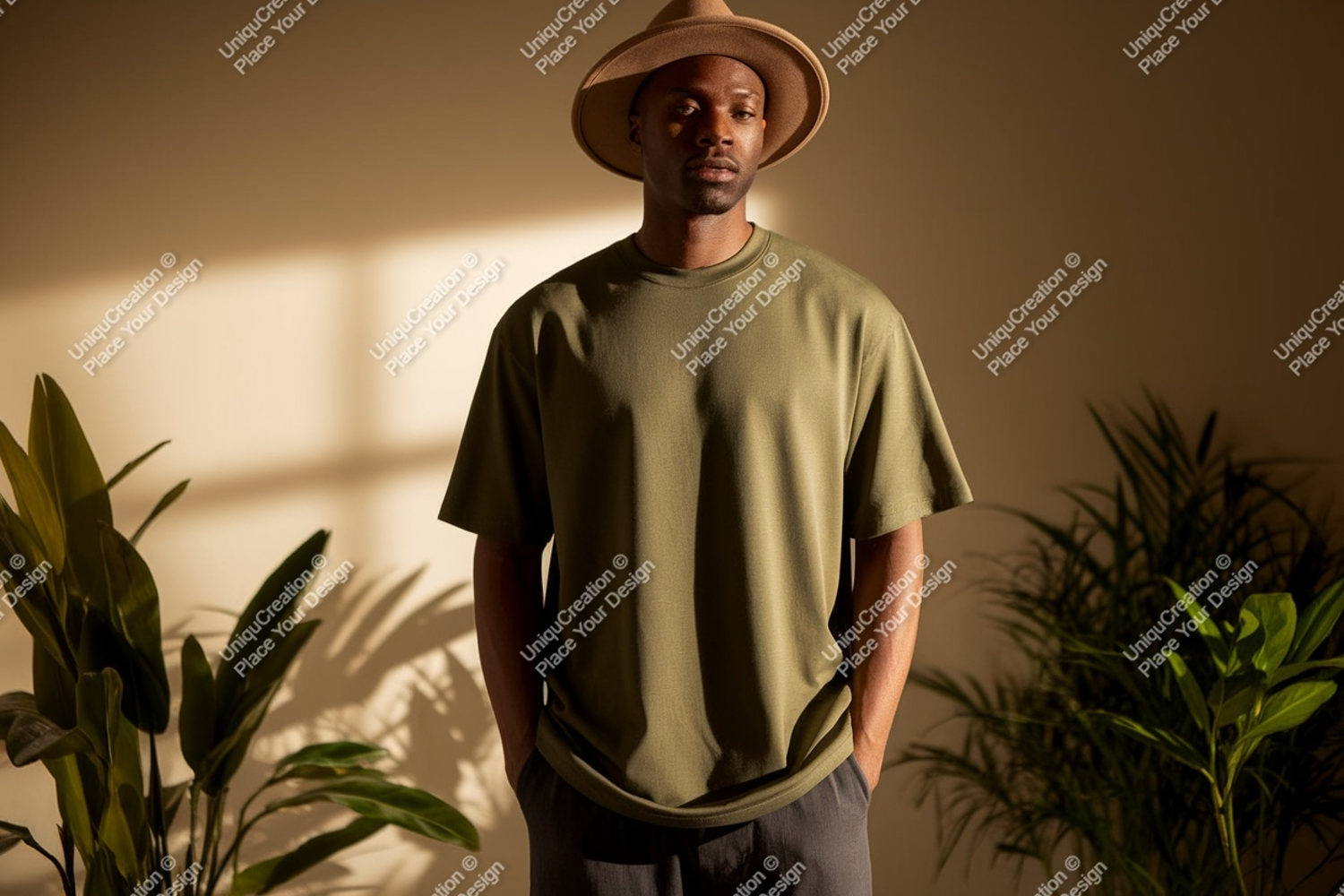 Man Shirt Mockup Hat Olive Plants Shadows T