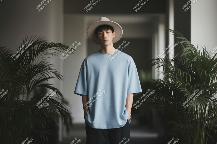 Fashion Man Shirt Casual Mockup Blue Hat Plants T Indoor