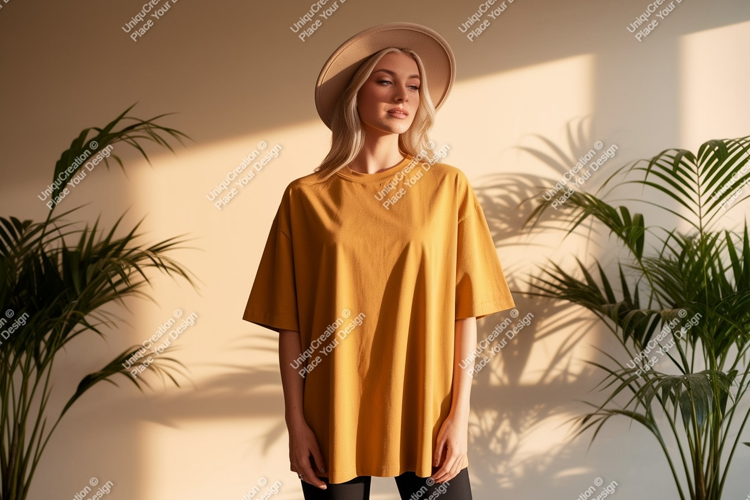 Similar Design Products to Woman wearing mustard oversized t shirt and hat image