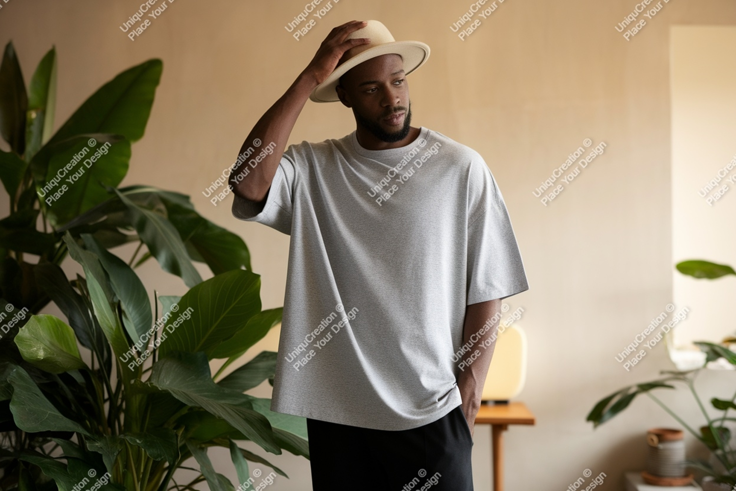 Stylish Fashion Man T-shirt Casual Mockup Hat Grey Plants Indoor