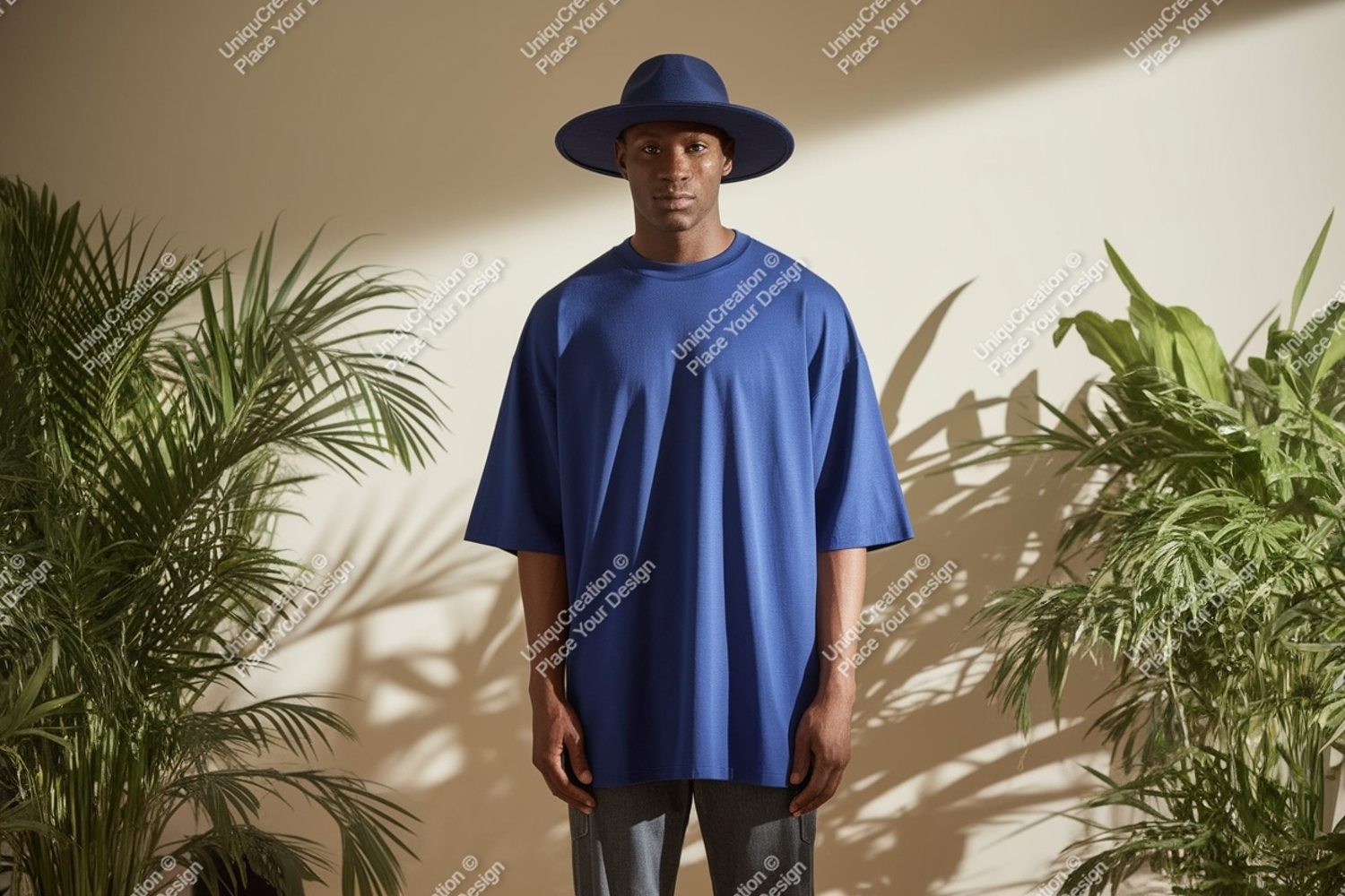 Fashion Man Shirt Mockup Studio Blue Hat Plants Shadows T