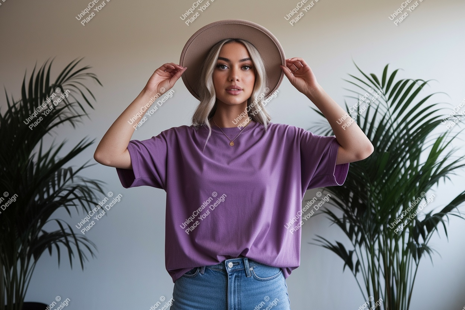 Fashion Shirt Mockup Woman Purple Jeans Hat Plants T Indoor