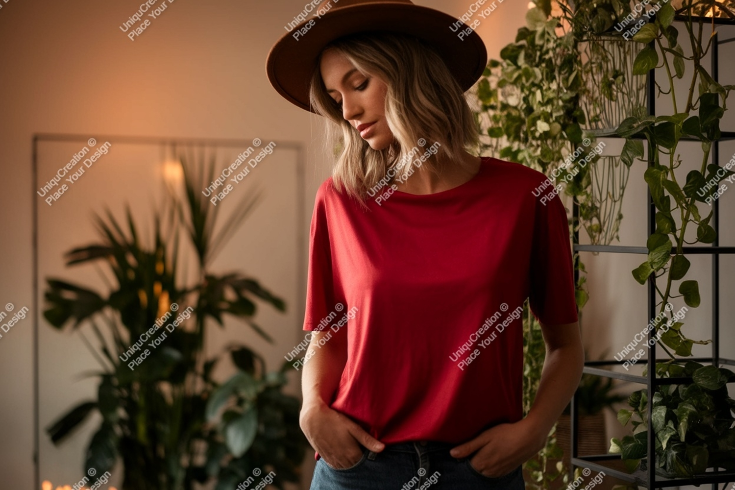 Fashion Shirt Casual Mockup Woman Hat Red Plants T Indoor
