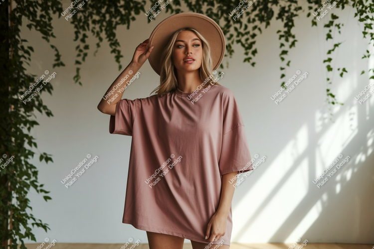 Similar Design Products to Woman wearing oversized pink t shirt and hat image