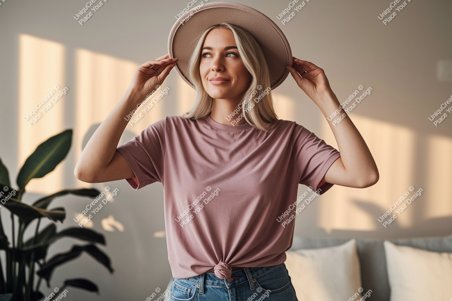 Shirt Pink Casual Woman Plant Jeans Hat Blonde T Indoor