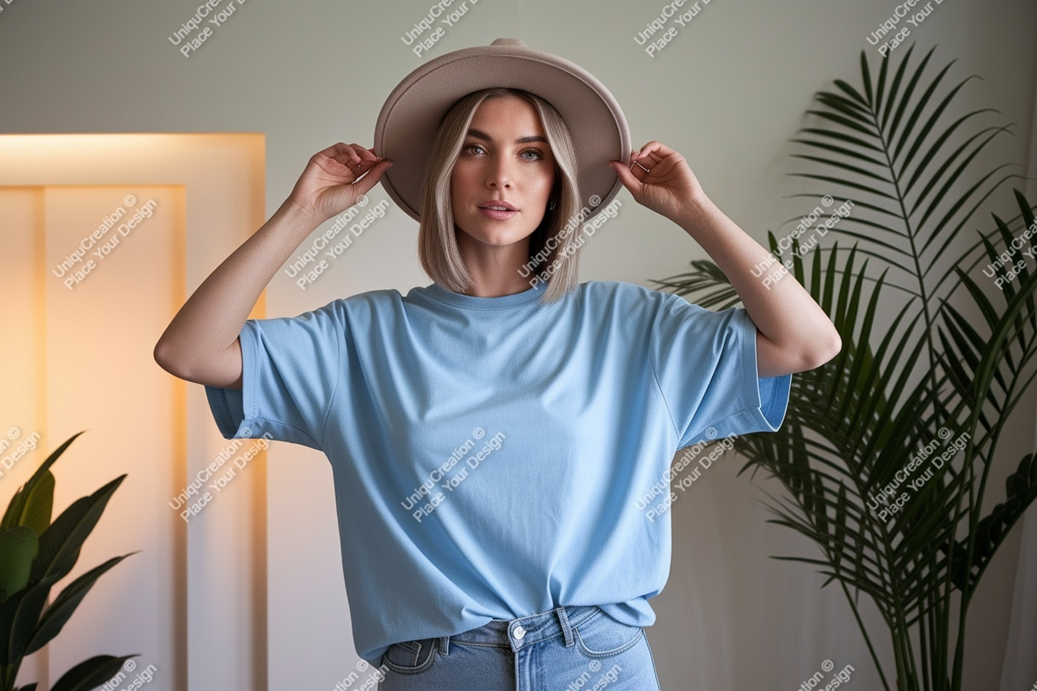 Stylish Fashion T-shirt Casual Mockup Woman Blue Hat Portrait Blonde