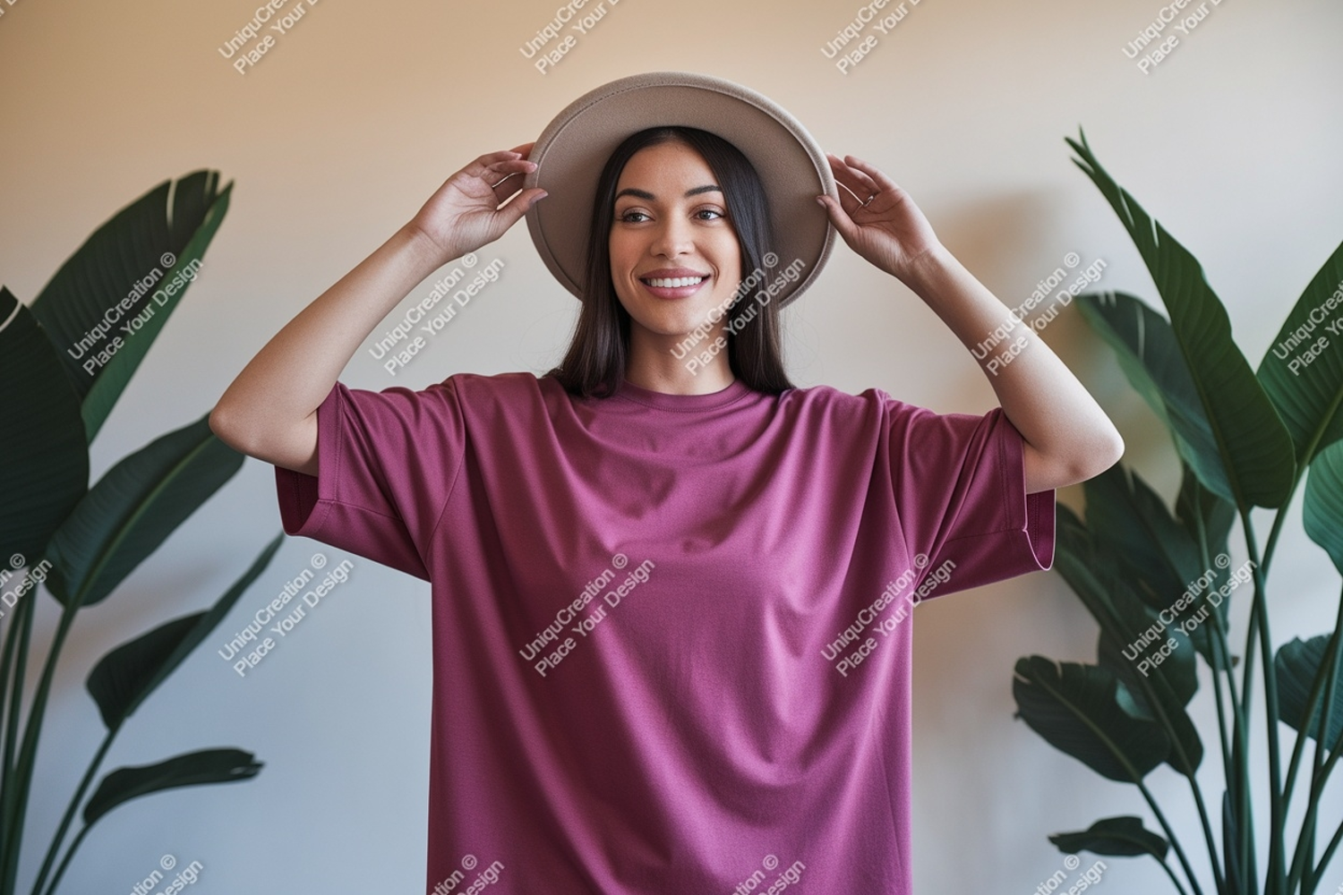 Fashion T-shirt Pink Mockup Woman Hat Plants