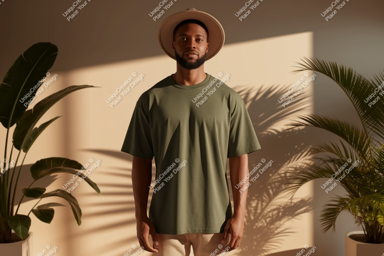 Man Shirt Green Mockup Hat Olive Plants Shadows T
