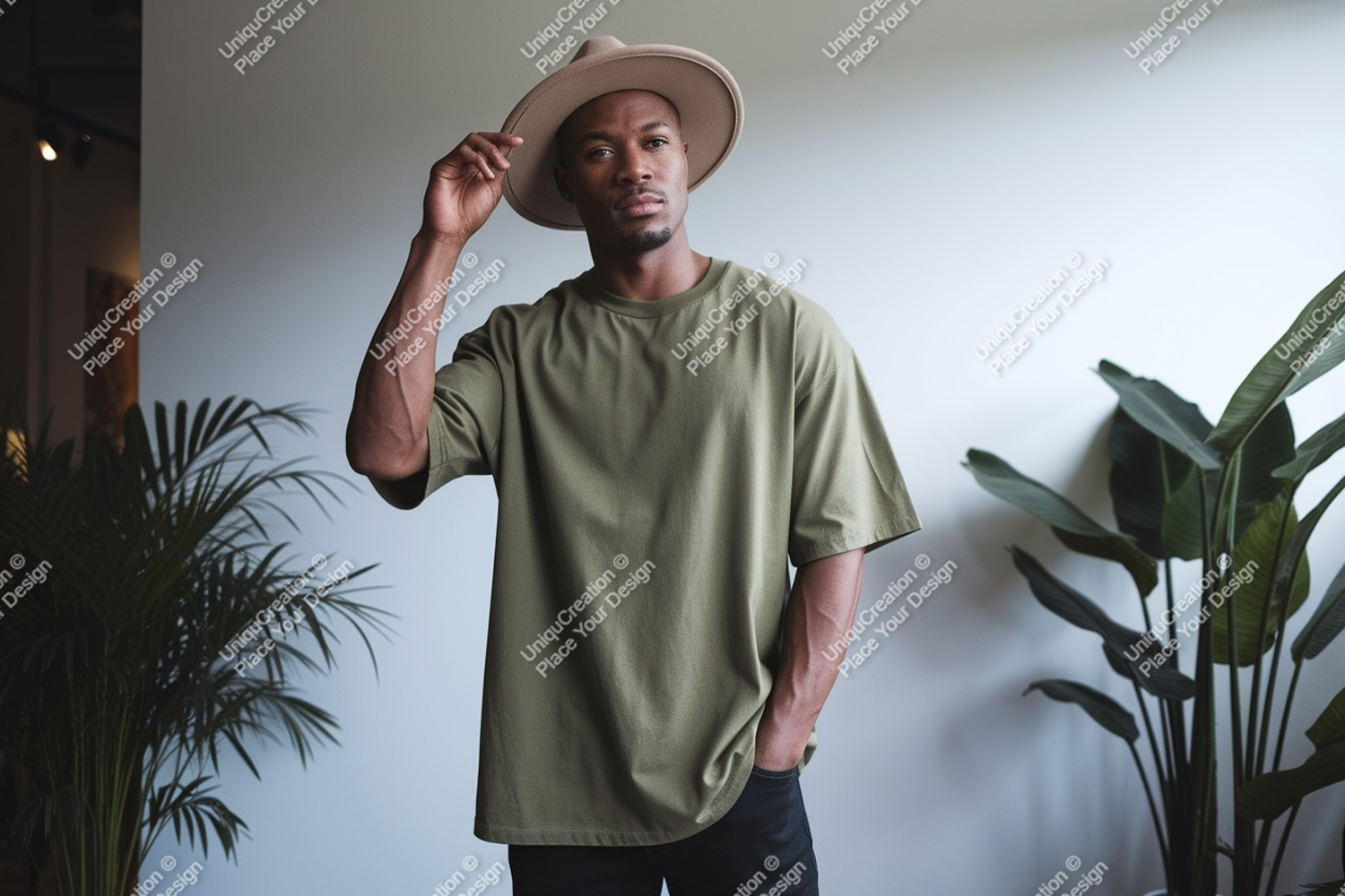 Fashion Man T-shirt Casual Green Mockup Studio Hat Olive Indoor