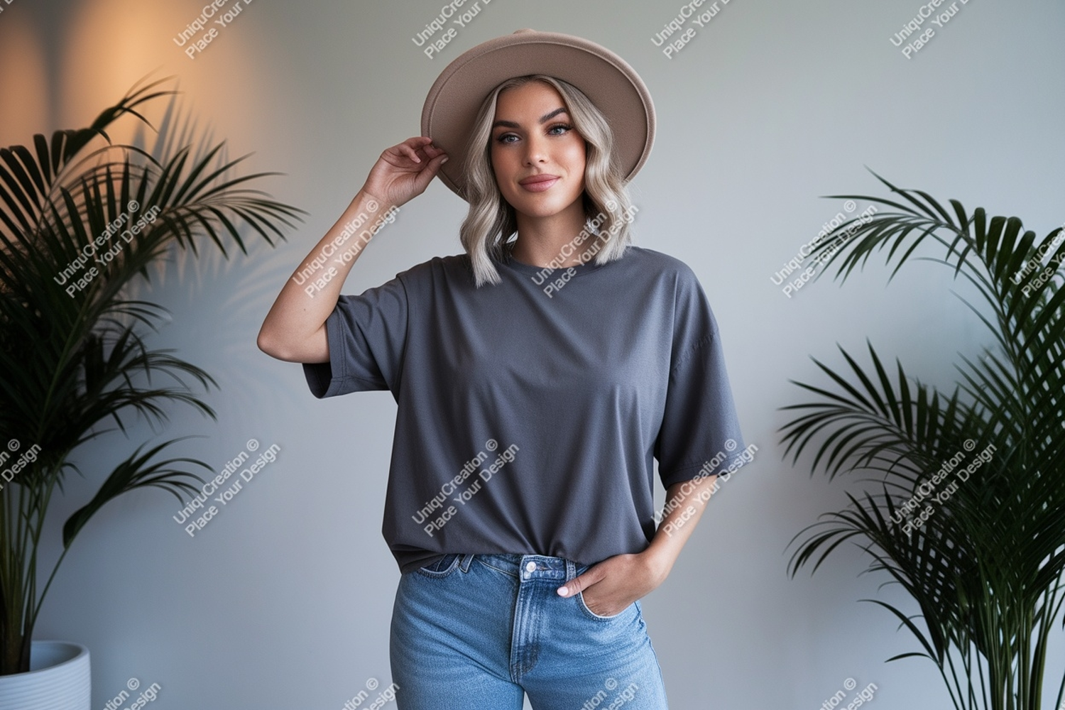Shirt Mockup Woman Jeans Hat Grey Plants T Indoor