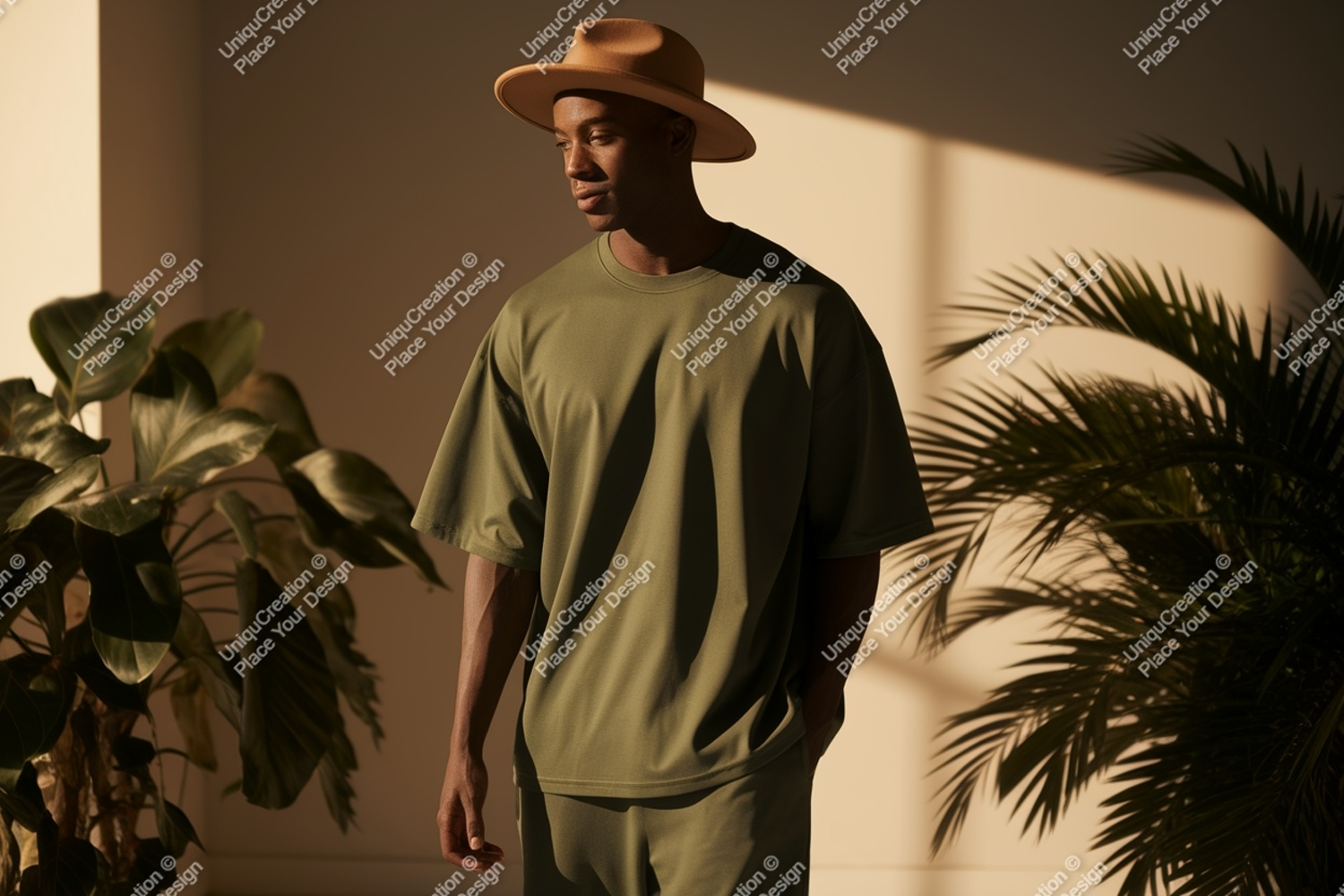 Similar Design Products to Man wearing olive green t shirt and hat image