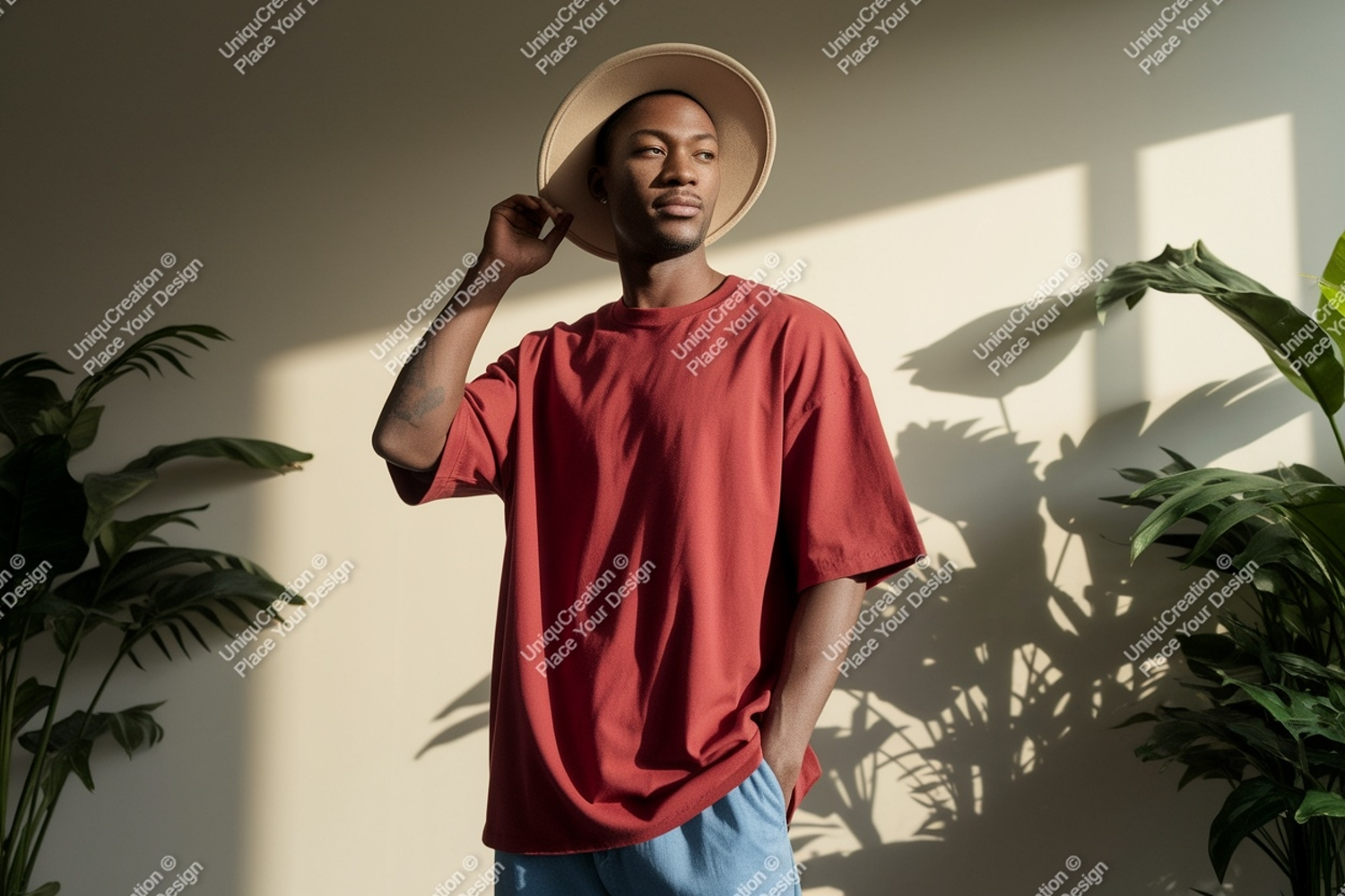 Similar Design Products to Man wearing terracotta t shirt and hat image