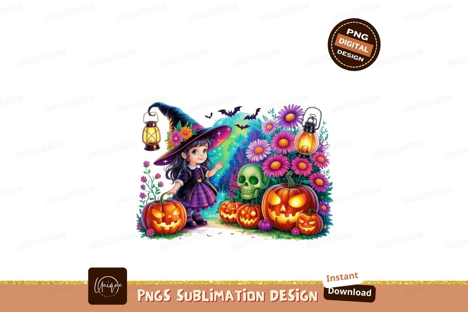 Similar Design Products to Little witch with pumpkins and flowers halloween skull