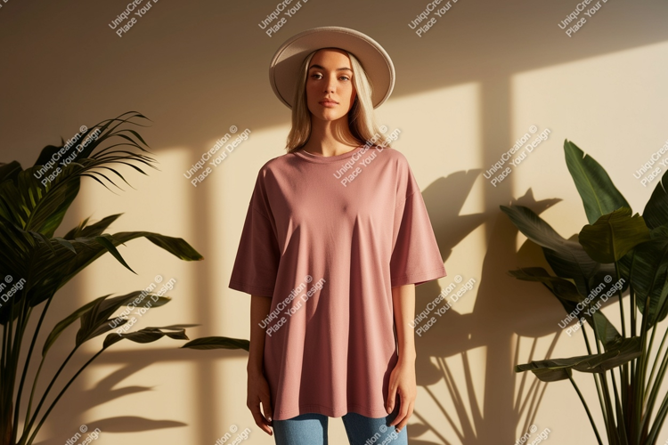 Shirt Pink Mockup Woman Hat Plants Shadows T
