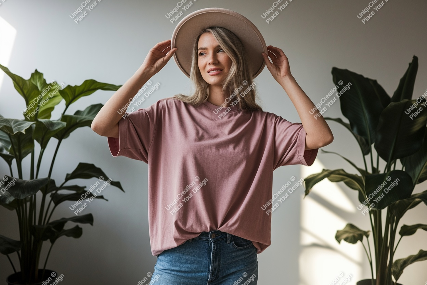 Fashion Shirt Pink Casual Mockup Woman Hat Plants Denim T