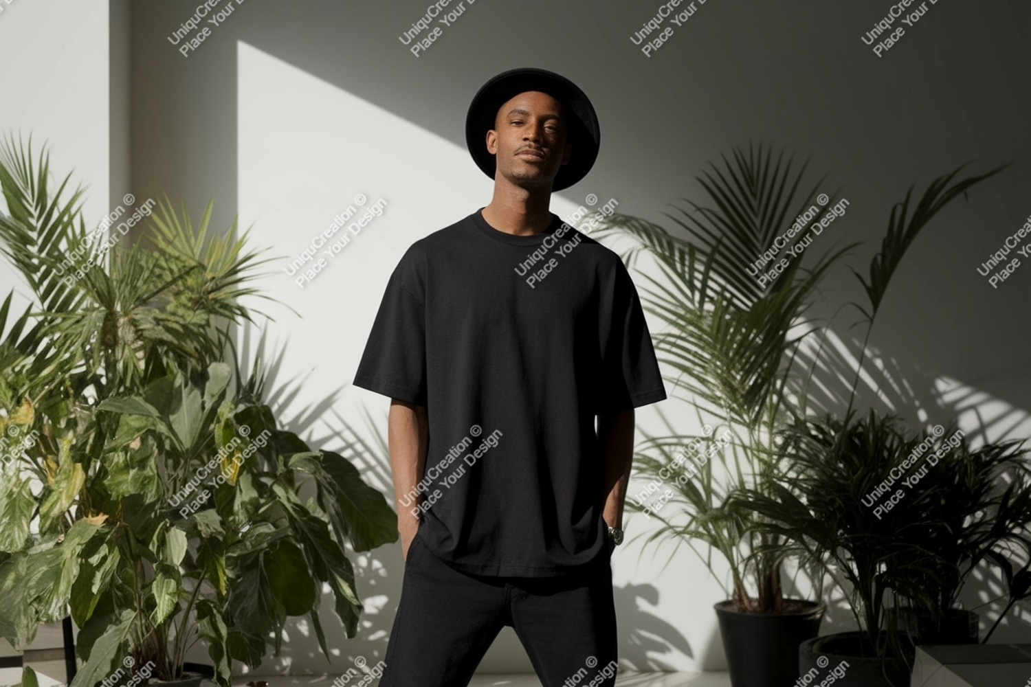 Fashion Man Black Shirt Casual Mockup Hat Plants T Indoor