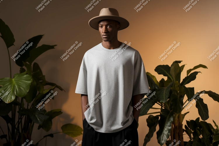 Fashion Man T-shirt Mockup Studio Hat Grey Plants