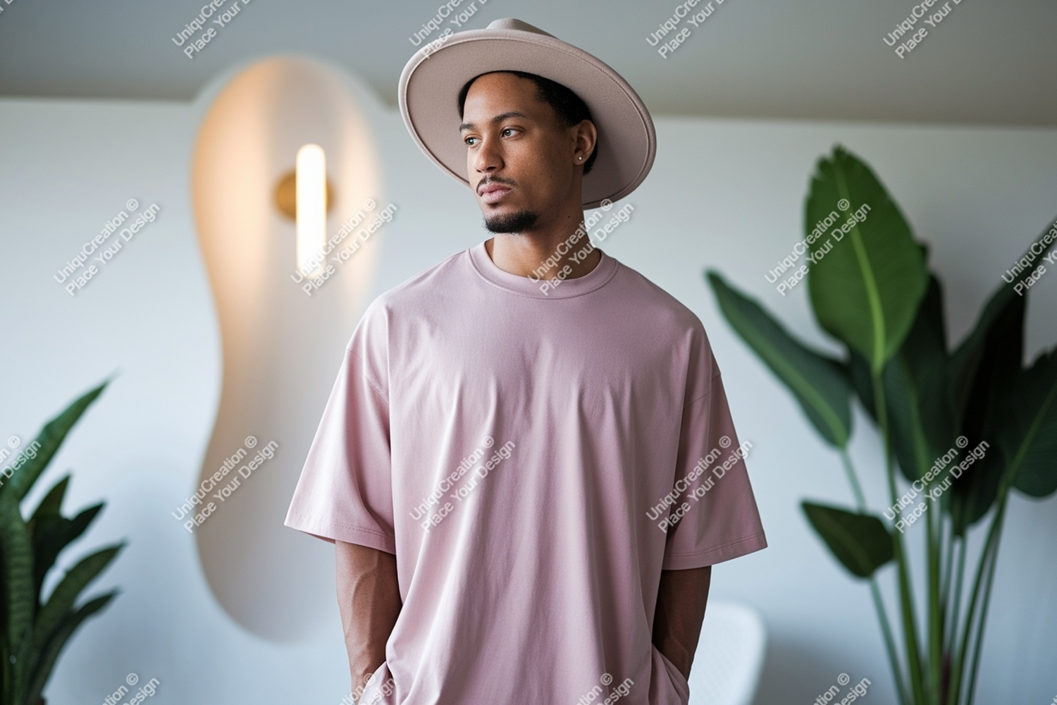 Modern Man T-shirt Pink Casual Mockup Plant Hat Indoor